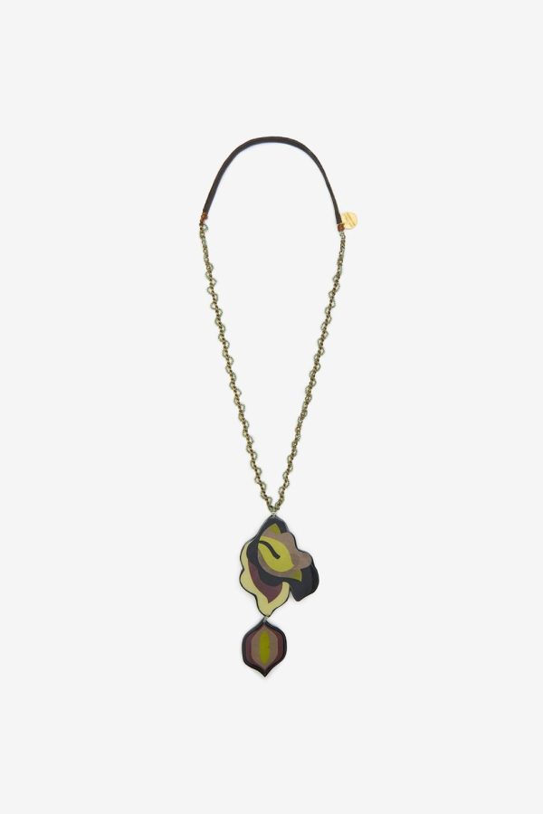 Metal chain necklace with bead on bead embroidery made with ♥ and leather tubular. Resin pendant with collection print and yarn tassel.