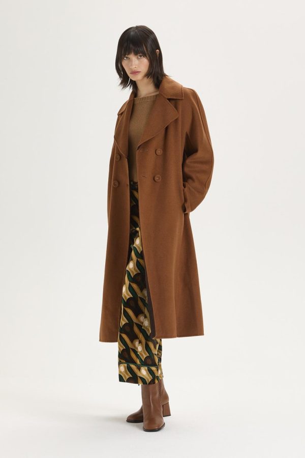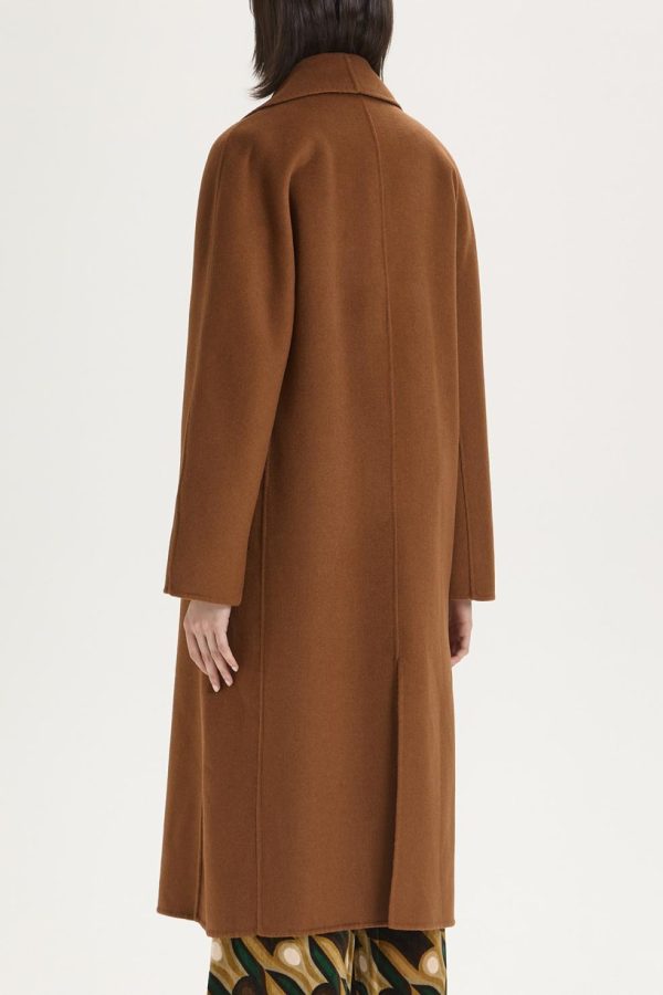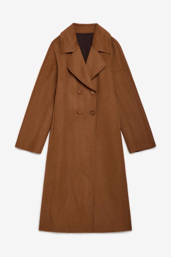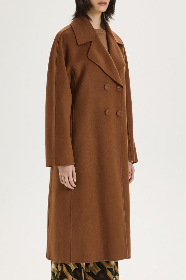 Reversible double-breasted coat with lapel collar, from two-colour wool and entirely hand-sewn, fastened with outside buttons covered in wool and a mix of buttons inside.