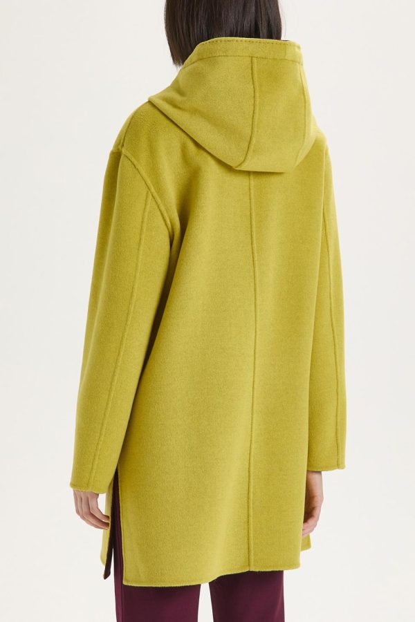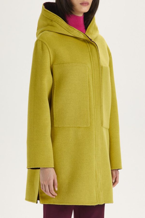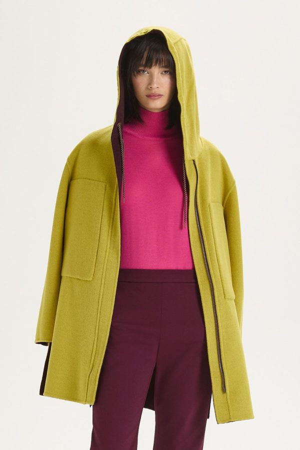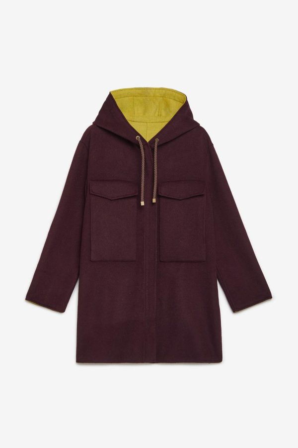 Reversible hoodie jacket, two-colour wool, entirely hand-sewn and with zip fastening.
