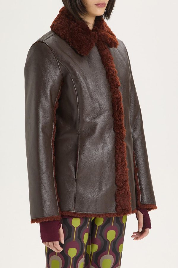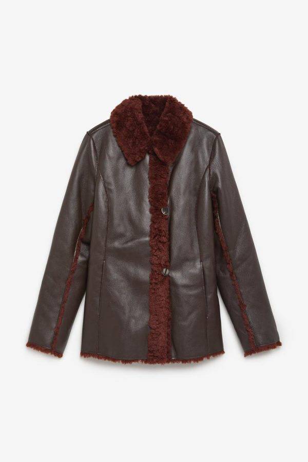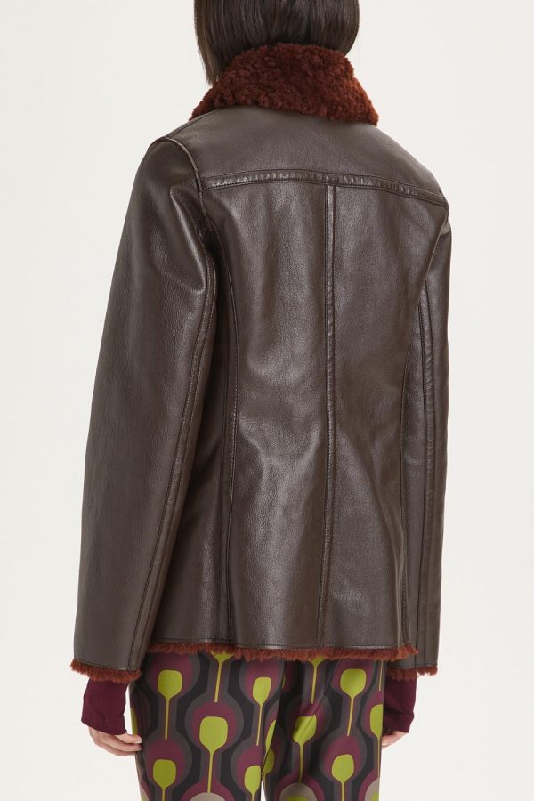 Close-fitting, reversible single-breasted jacket in eco-sheepskin and napa leather with a mix of special buttons. Recycled fabric.