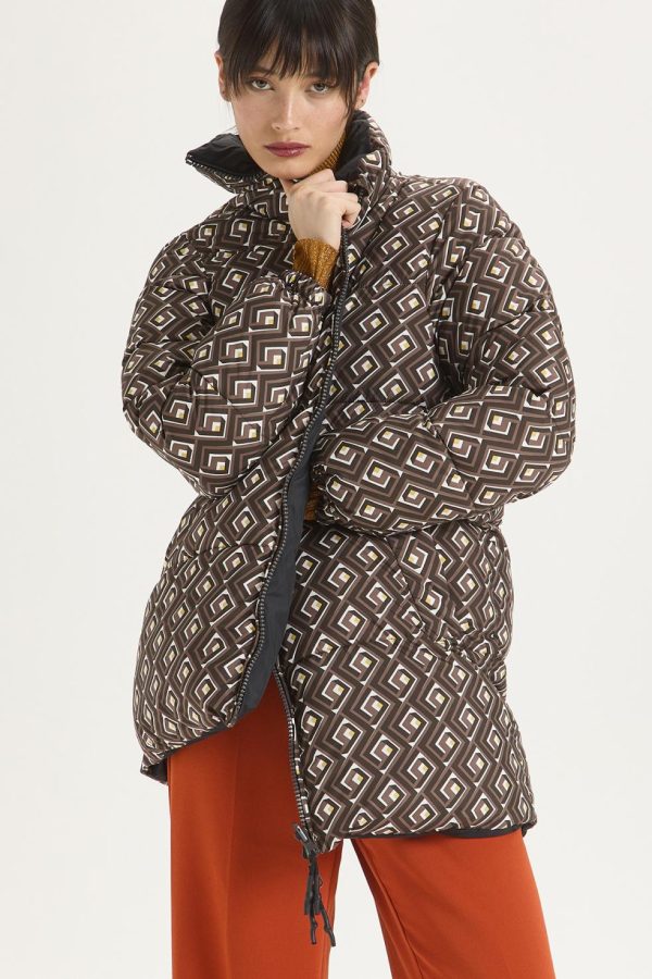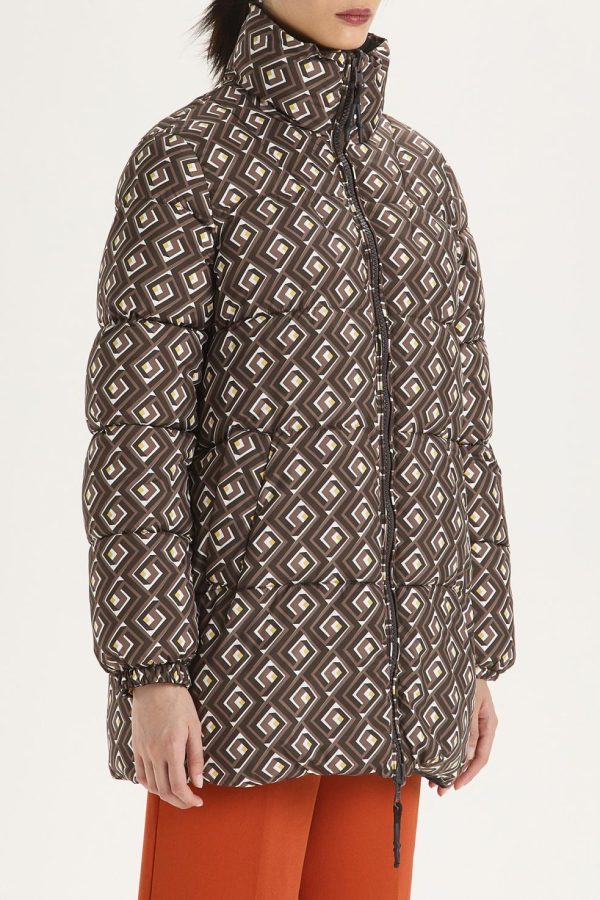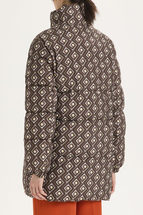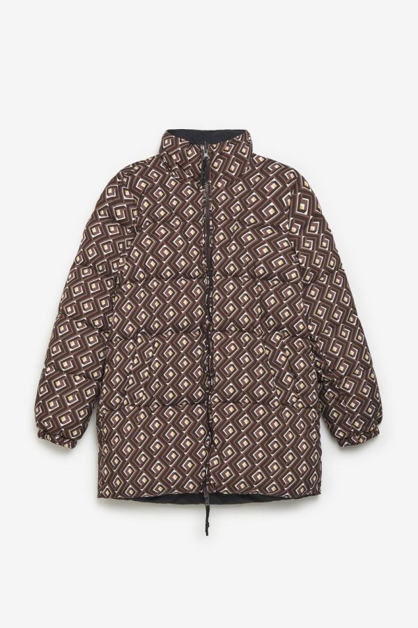 High collar padded jacket, in printed nylon on the outside and plain inside. Contrasting zip on the front. Sustainable fabric and padding.