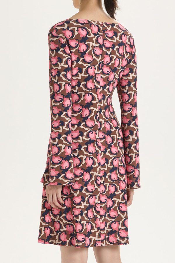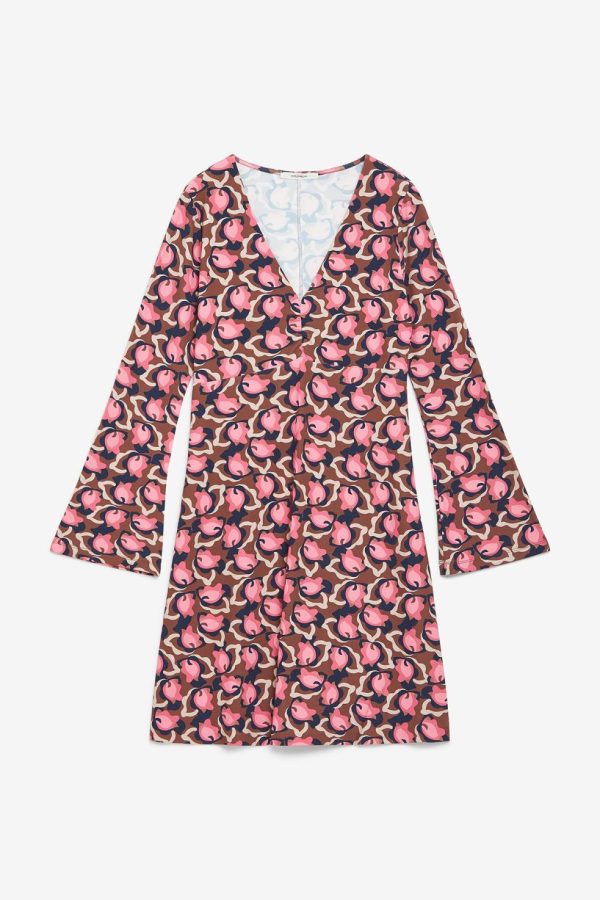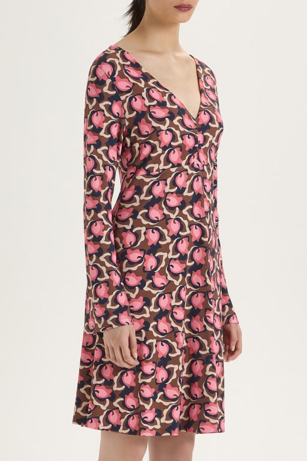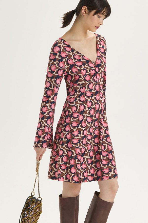 V neck, long sleeve and flared short dress in printed stretchy viscose interlock.