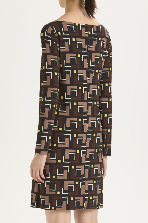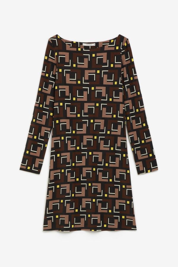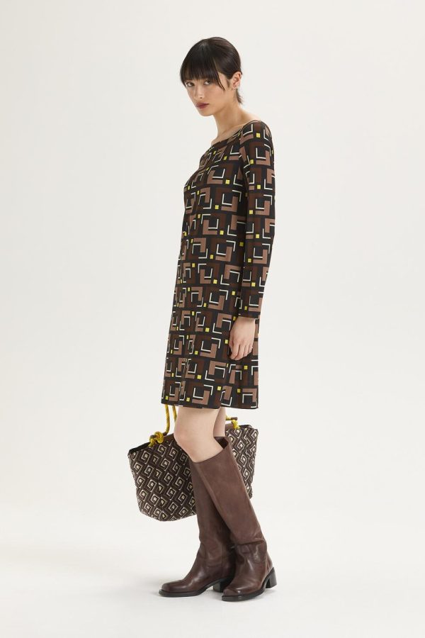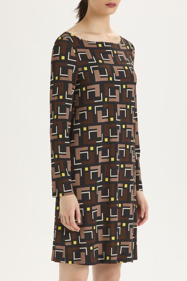 Boat-neck, long sleeve and close-fitting dress in printed stretchy viscose jersey.