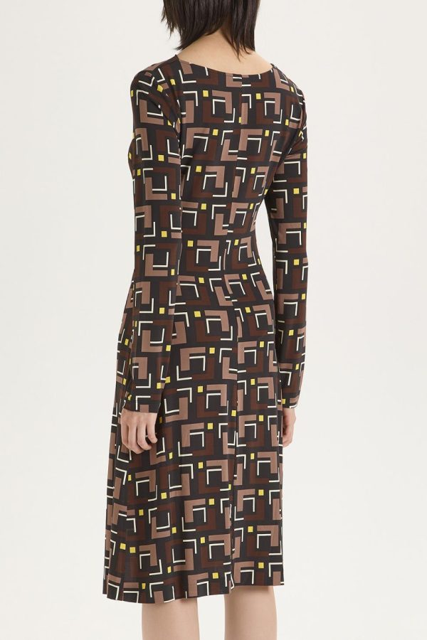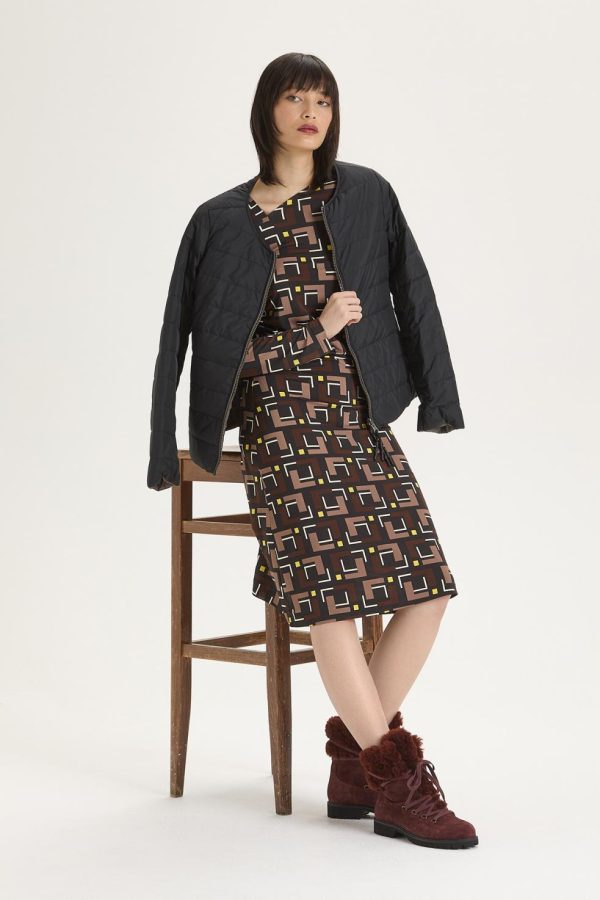 Slim fit, short dress, in printed stretchy viscose jersey, with asymmetric neckline, neck gloves and gathered on the hips.