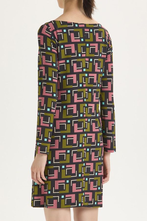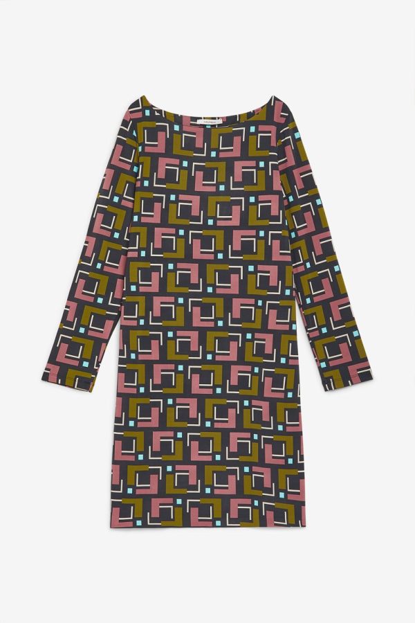 Boat-neck, long sleeve and close-fitting dress in printed stretchy viscose jersey.