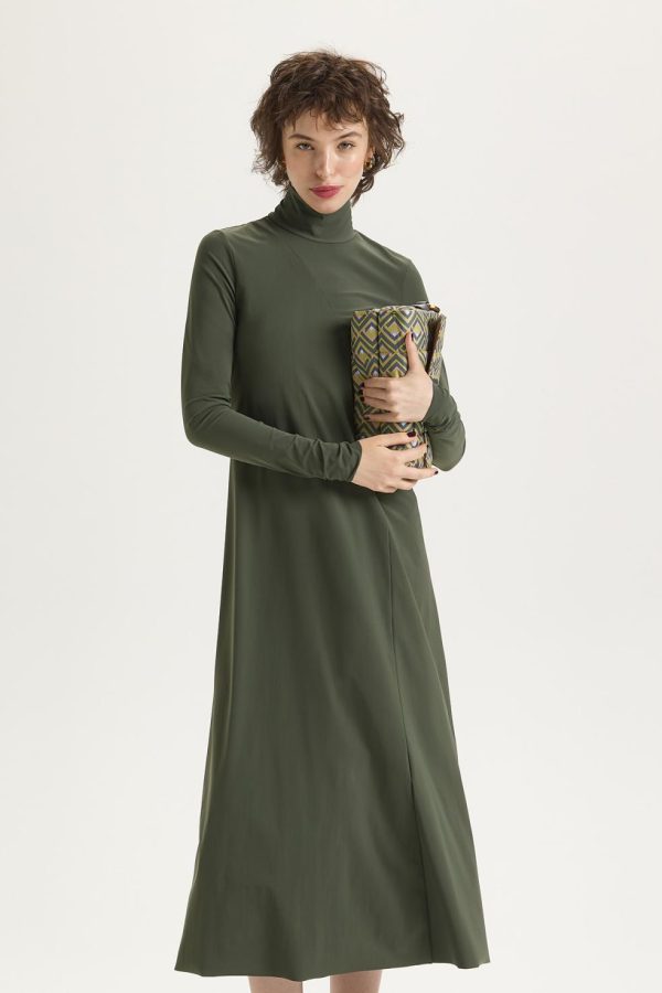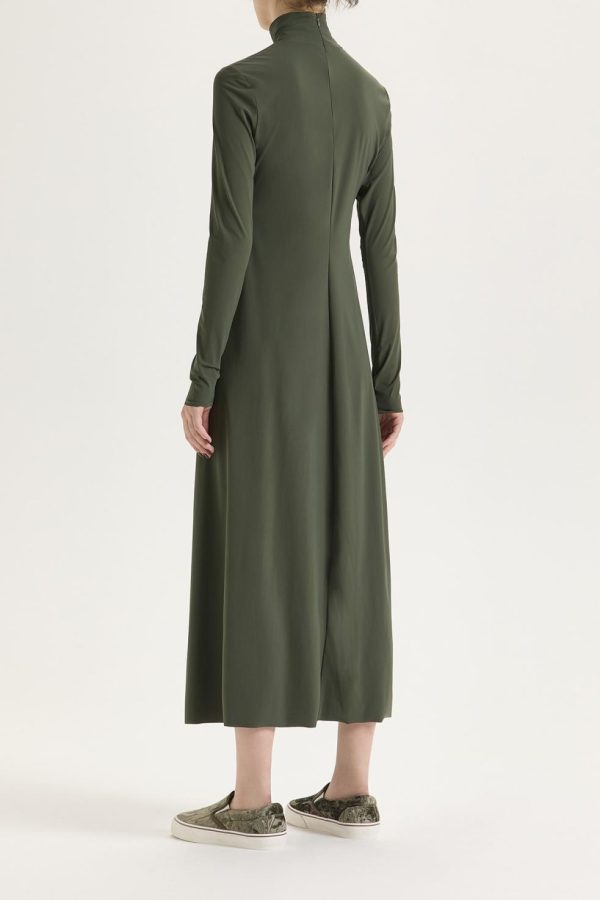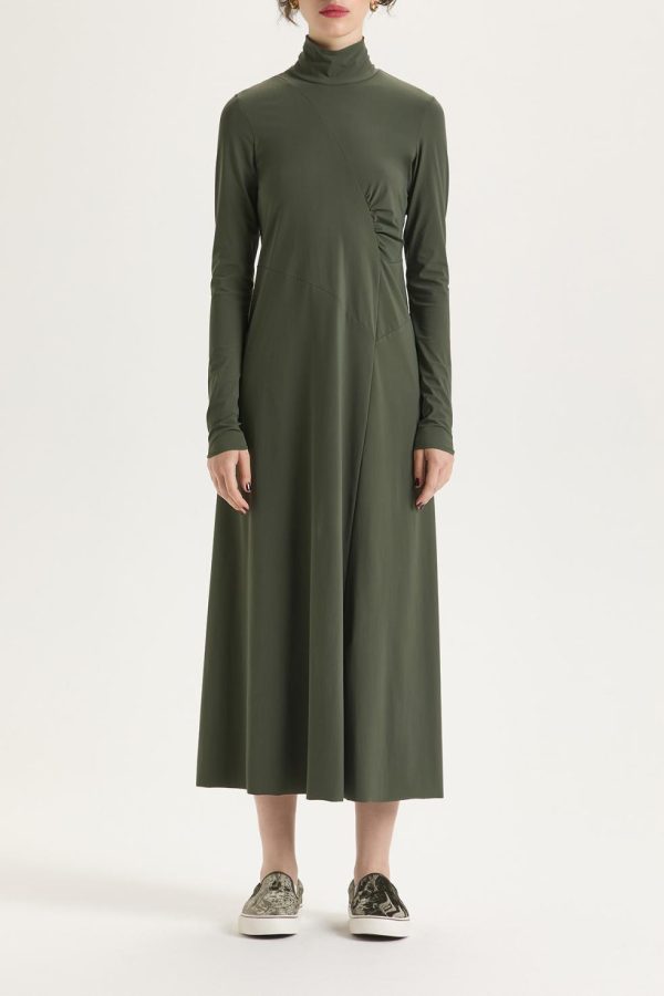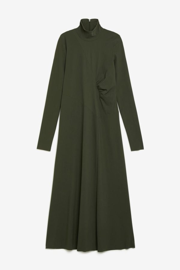 Longuette dress in plain-coloured technical stretch jersey, high collar, glove sleeves and asymmetrical cuts and draping on the front.