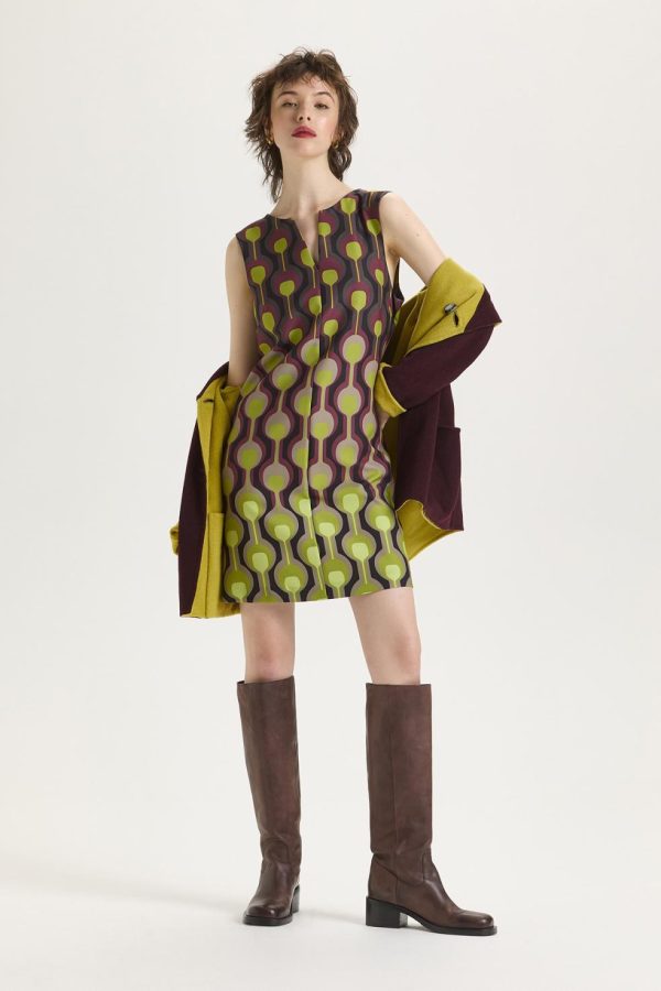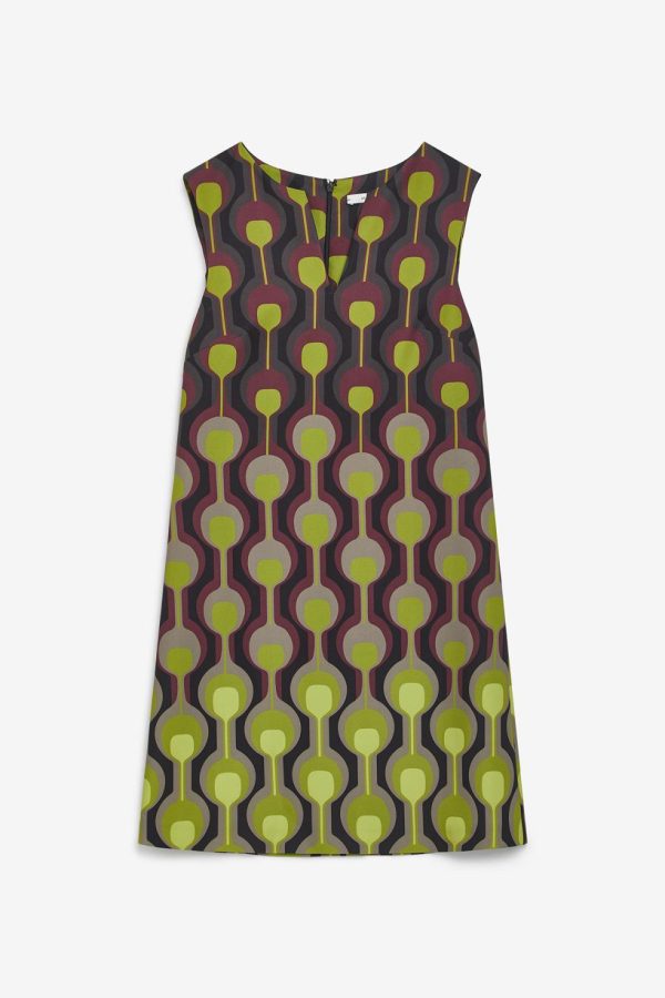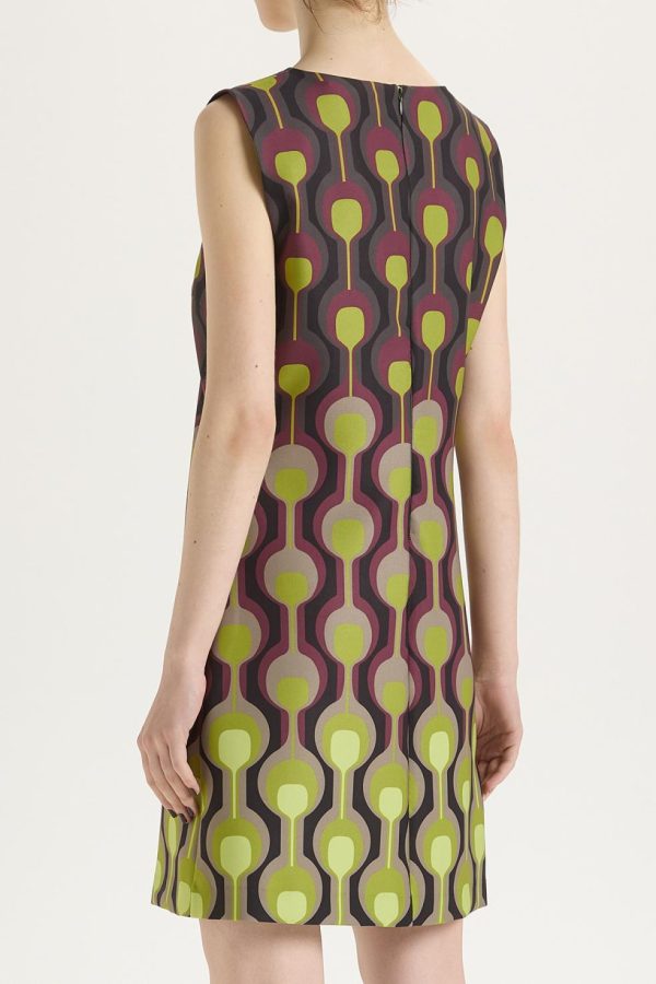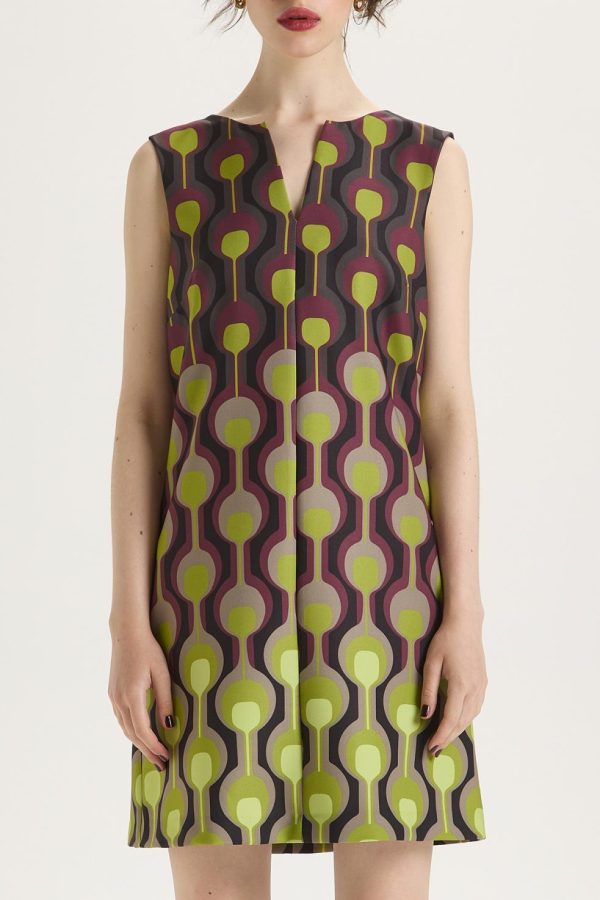 Close-fitting dress in stretchy printed technical cady, with side pocket. With round neck and sleeveless.