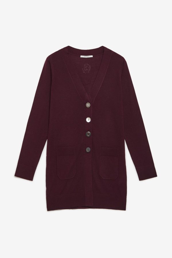 V-neck cardigan in pure merino wool and contrasting grosgrain on the inside list. With a mix of special buttons and corporate Maliparmi rose printed on the back.