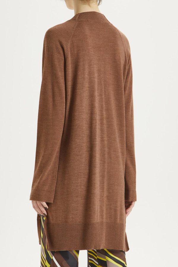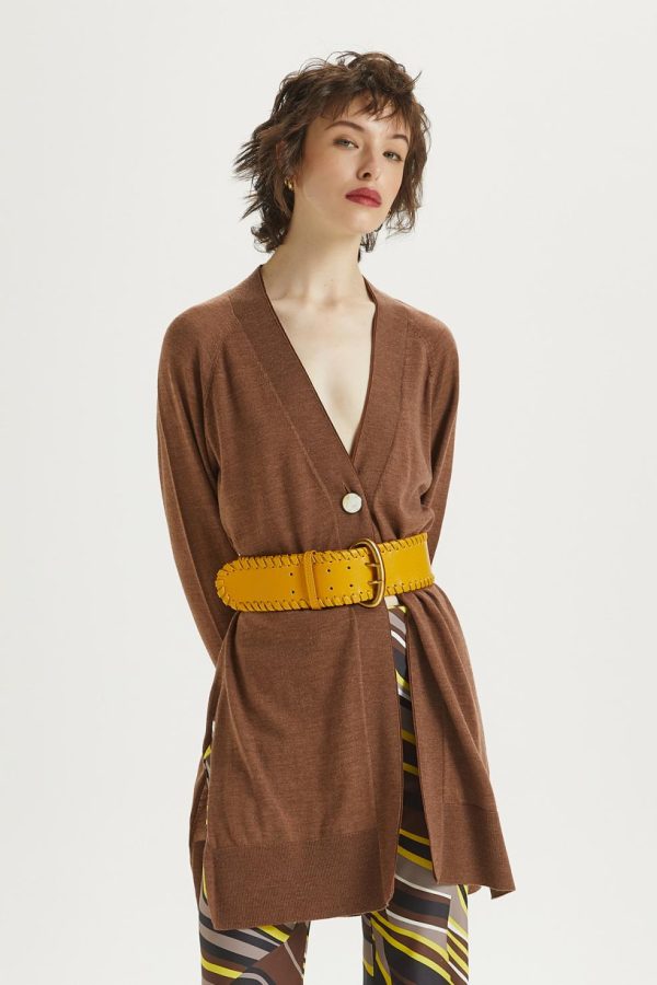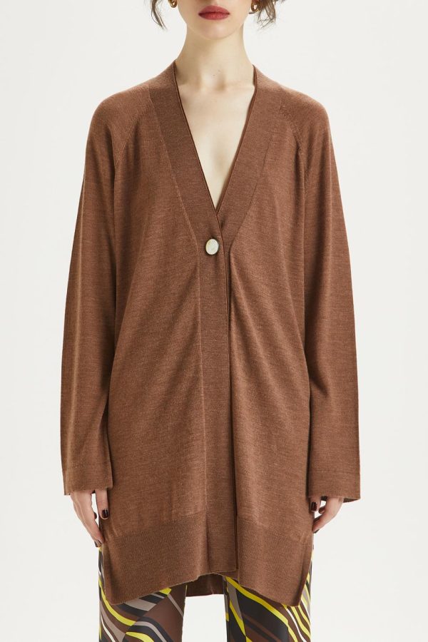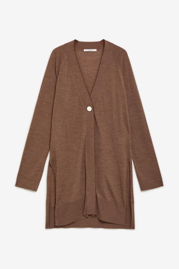 V-neck long pure Merino wool cardigan. Slits on the hips and matching grosgrain on the inside list, special button.