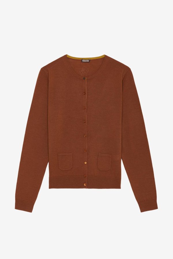 Round-neck short cardigan in pure merino wool, matching gros-grain on the inside edging, special button on top with the Malìparmi rose printed on the back.