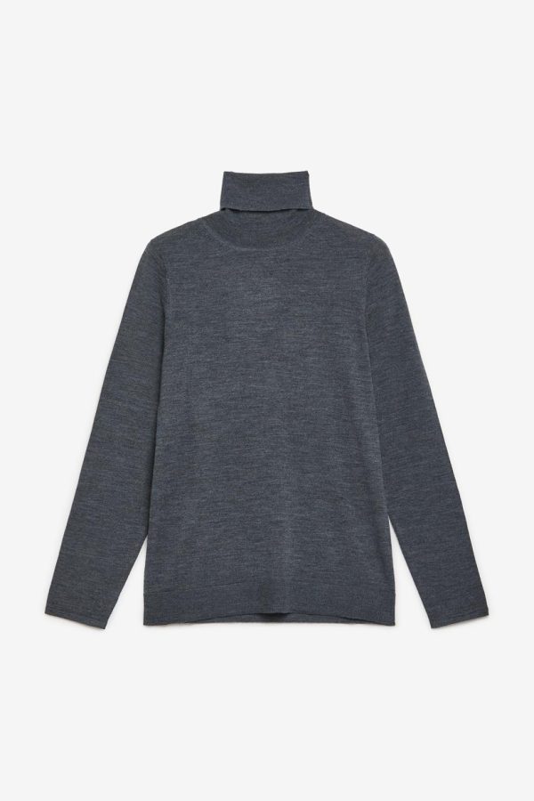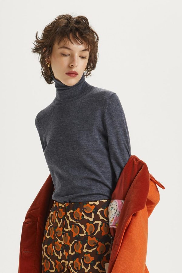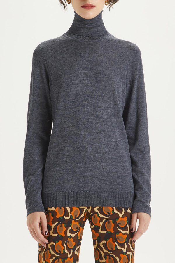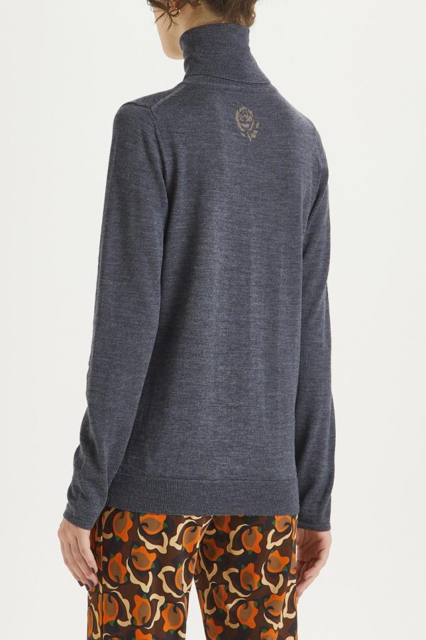 Pure merino wool roll neck, featuring the Maliparmi rose printed on the back.