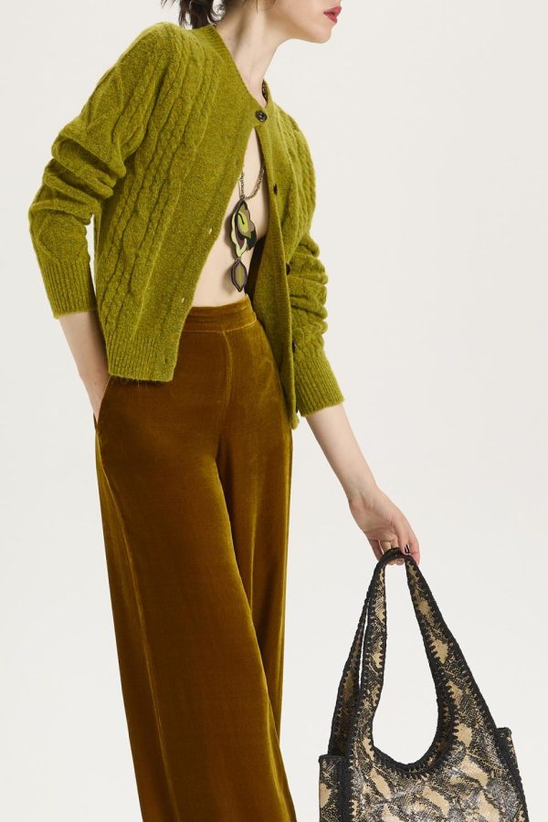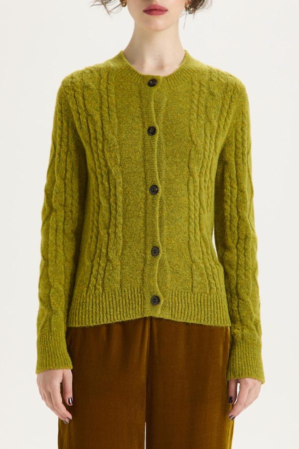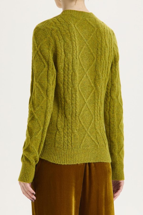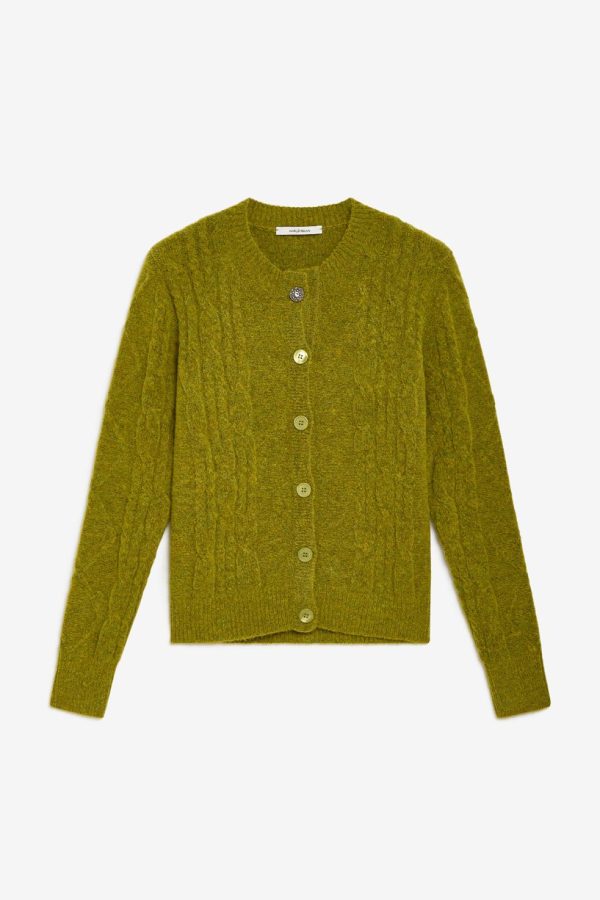 Round neck cardigan with Irish knit, diamond and braid pattern and special buttons. Made in Italy.