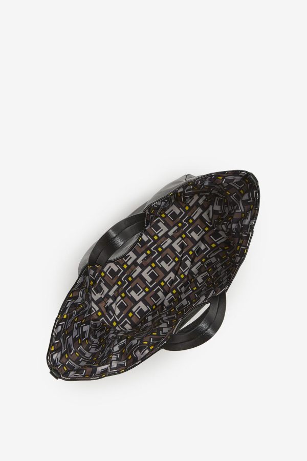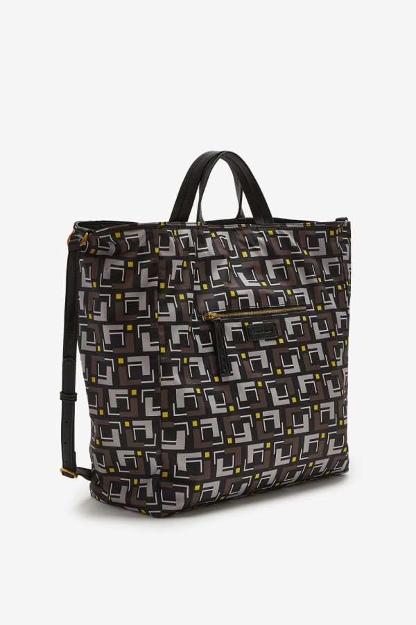 Mid-large sized North-South tote bag, very practical, reversible, made from faux-leather and printed nylon, featuring the collection patterns. Lightweight and practical with its inside pocket, it is ideal both for the city and for travelling, it can be folded and stored flat. Featuring the large branded logo, it can be carried as a handbag or on the shoulder thanks to the detachable and adjustable shoulder strap.