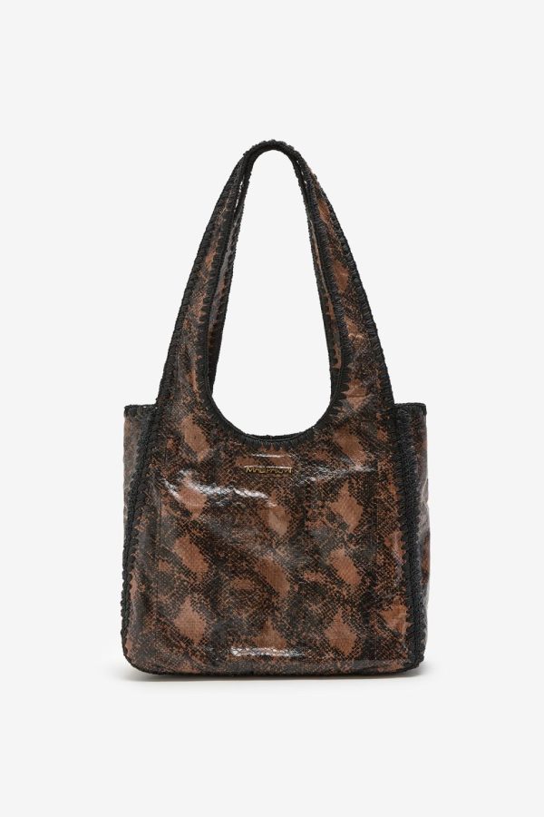 New compact and practical Hobo bag, made of Whips leather with a python print and crochet work in entirely handmade construction. Despite of its size, it is very light and the perfect travel companion; it can be folded up and easily put into a suitcase. Light, soft and practical with its internal pocket zip. Logoed on the top front quarter.