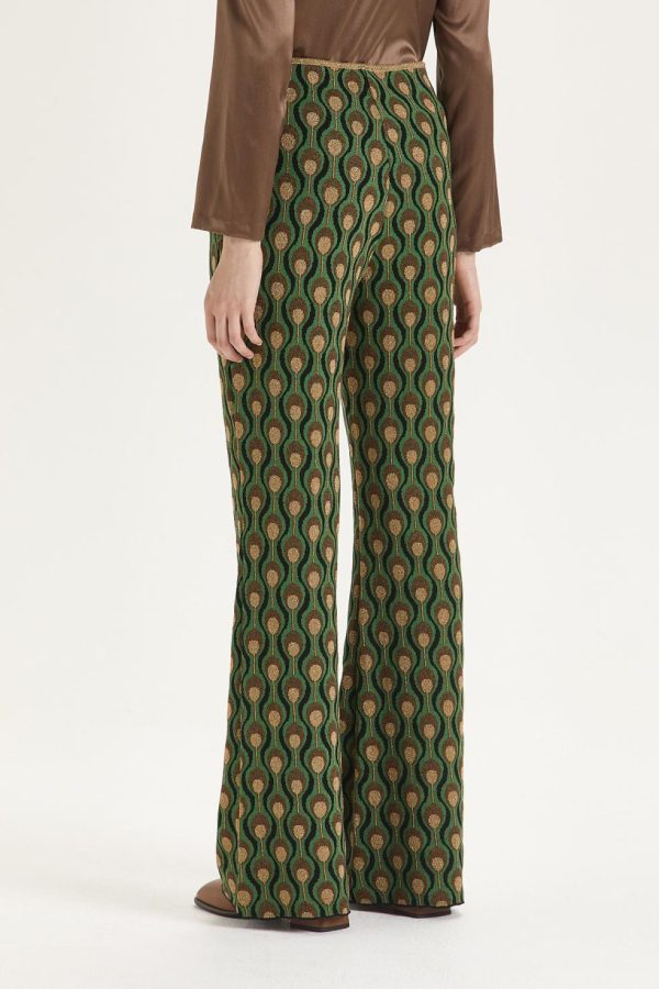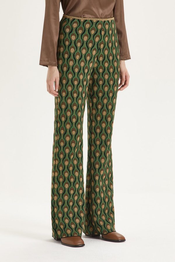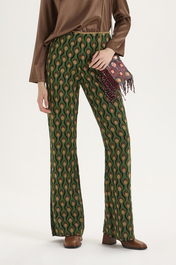 Flared trousers in jacquard comfort stretch viscose with elasticated waist and multicolour design, gauge 12. Made in Italy.
