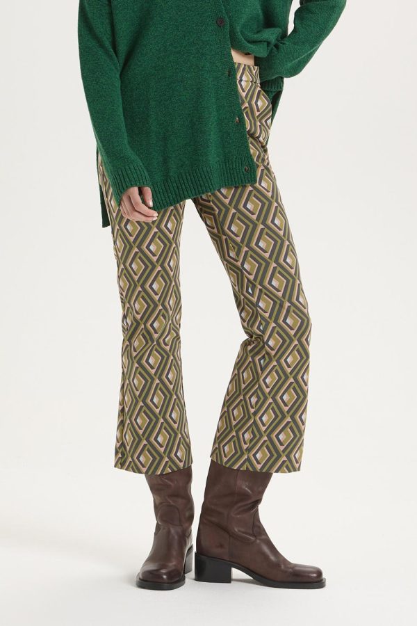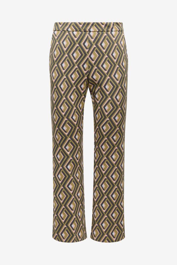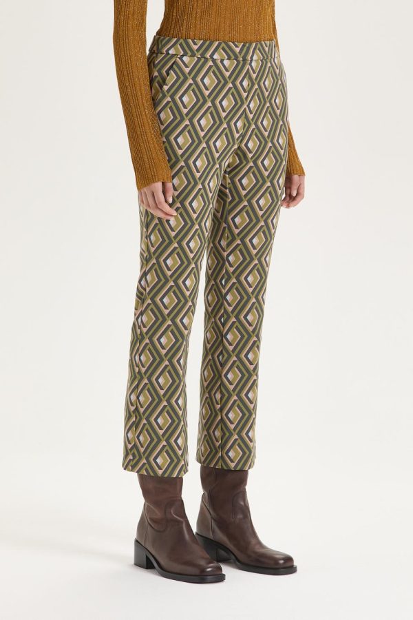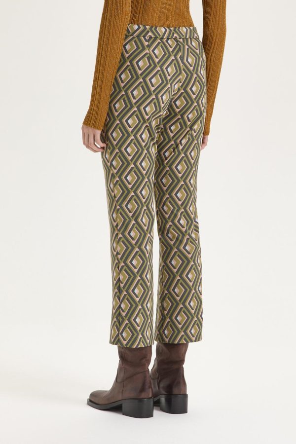 Flared trousers in geometric jacquard fabric, with side zip and slant pocket.