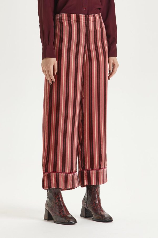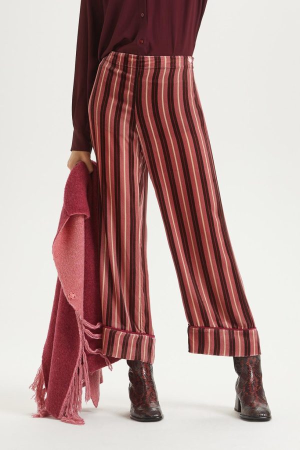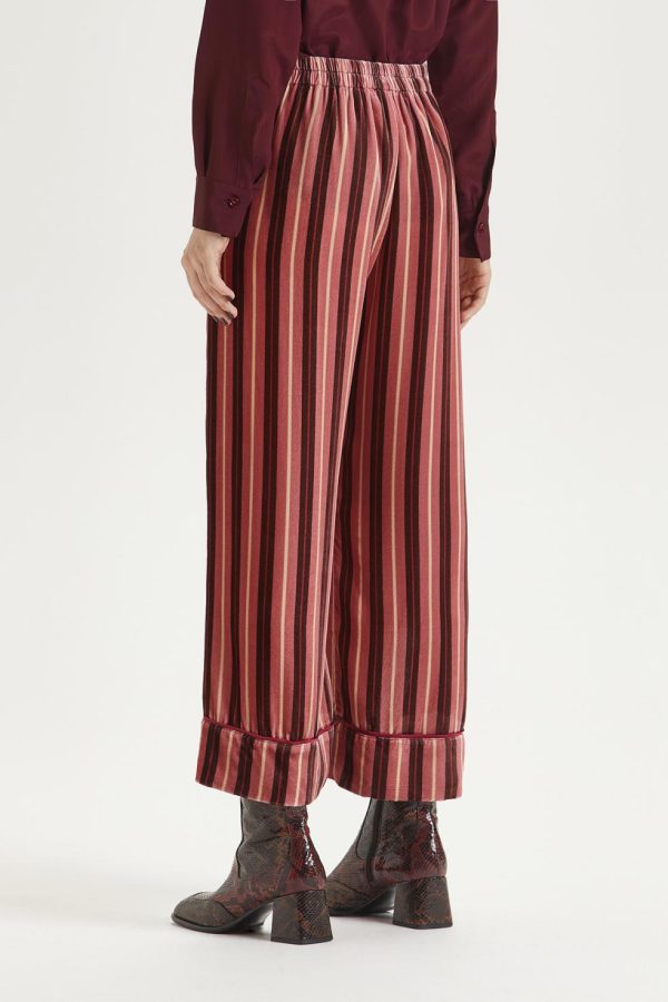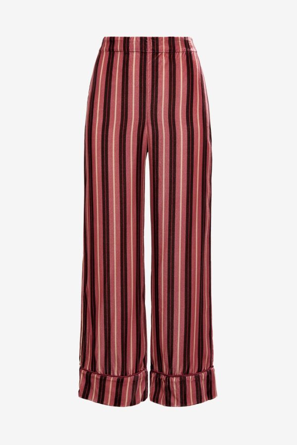 Straight-leg trousers in printed silk viscose velvet, with bottom flounce and contrasting piping.