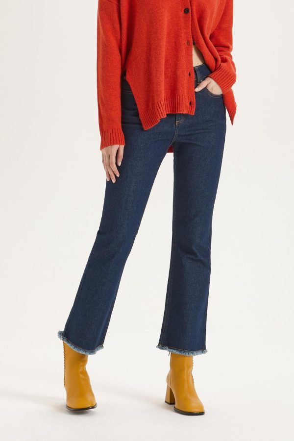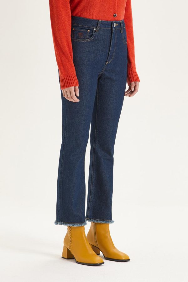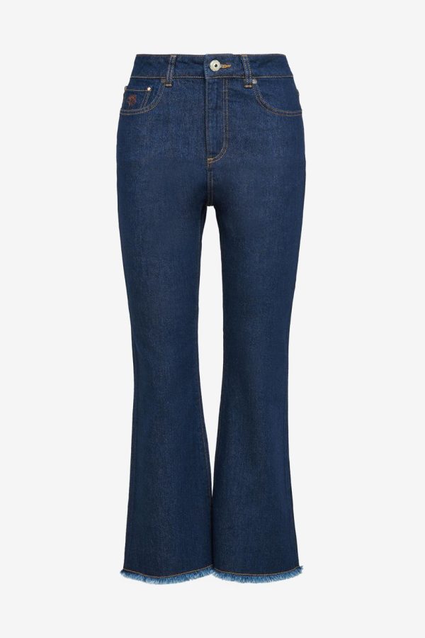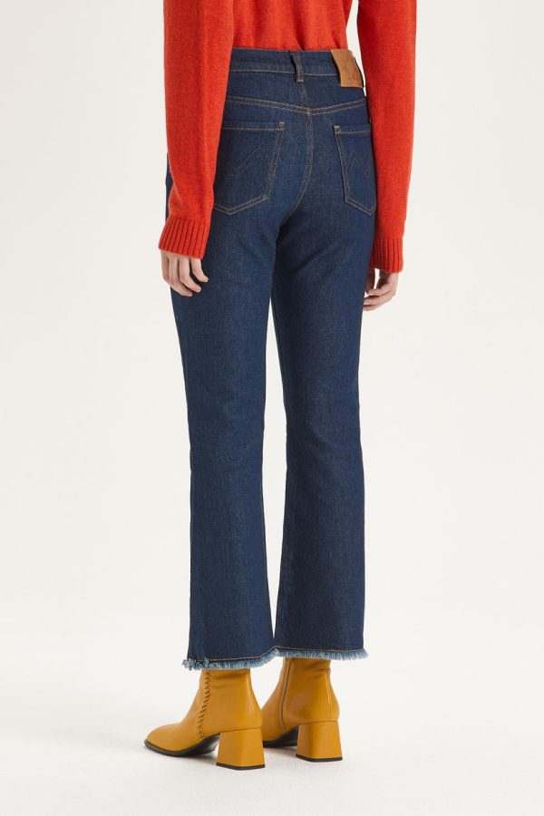 5-pocket trousers, washed stretchy blue denim and flared leg. It features the rose, the brand’s symbol, embroidered on the watch pocket and on the back pockets the iconic Maliparmi embroidery with an M pattern.